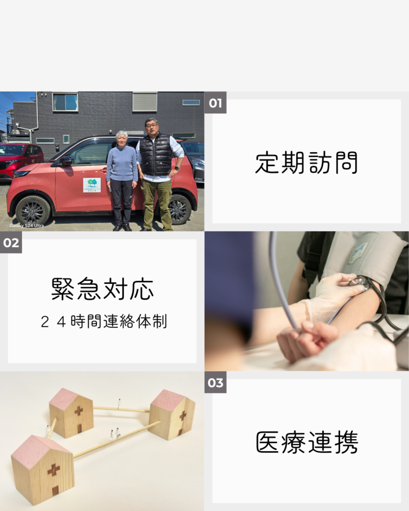 連携医療機関や訪問看護、ケアマネージャーと連携しながら、体調の変化にもすぐ対応できるよう見守り、在宅での療養を支えます。