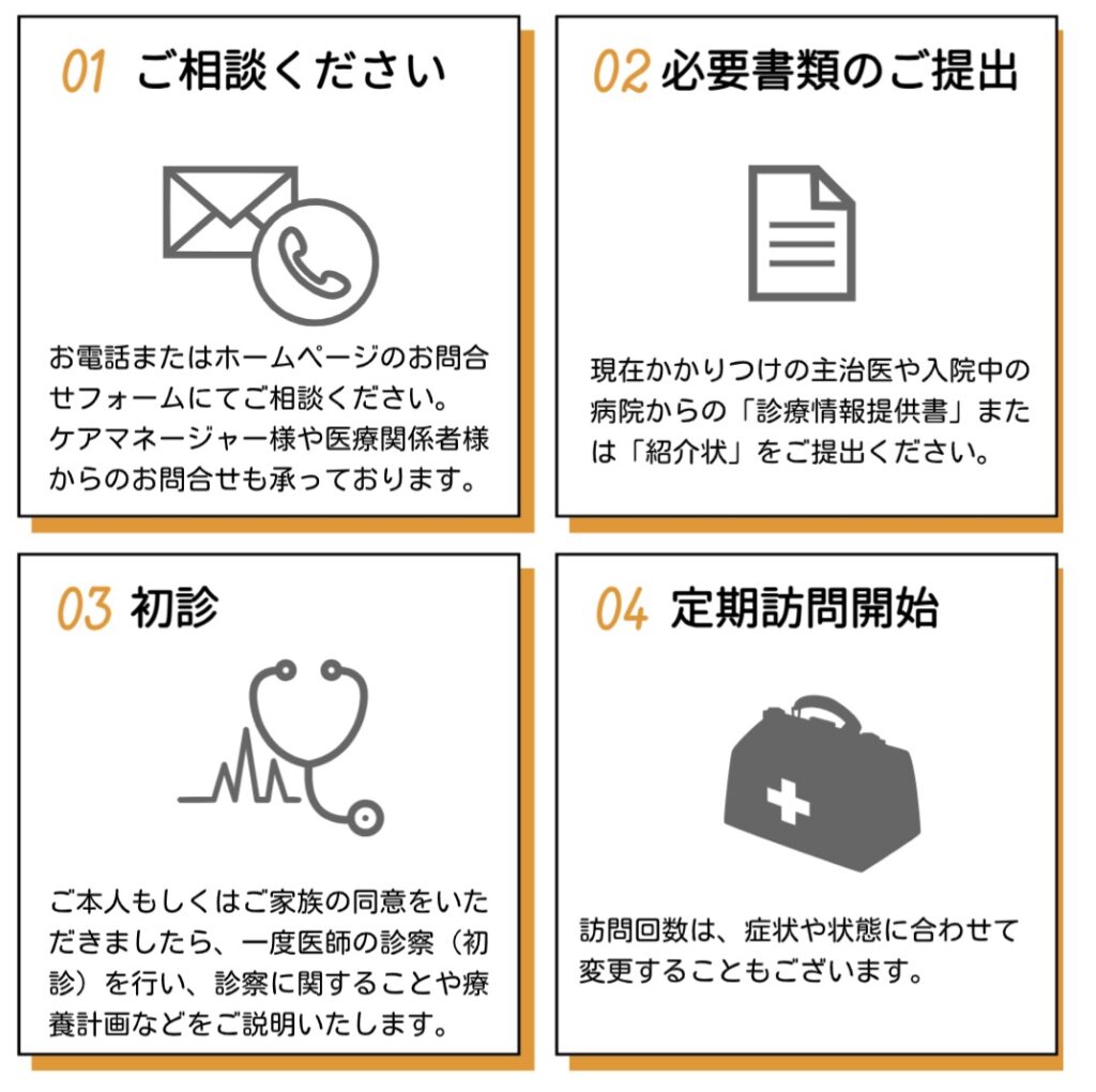 加齢に伴う様々な障害をお持ちの方や、脳卒中・悪性腫瘍・神経難病などで通院が困難な方が対象となります。具合が悪くなった時のみ診療を行うのではなく、定期的な診療を通じで、ご自宅で自分らしい生活を送るお手伝いを致します。